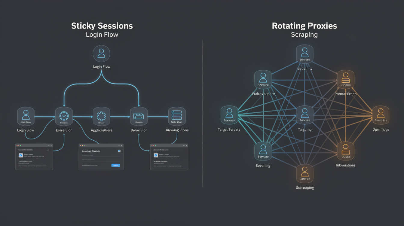 Sticky sessions and rotating proxies solve different problems. Sticky sessions are usually better for continuity-heavy workflows such as logins, dashboards, checkout testing, and repeatable QA. Rotating proxies are usually better for broad, stateless work such as large-scale scraping, discovery, and distributed monitoring.